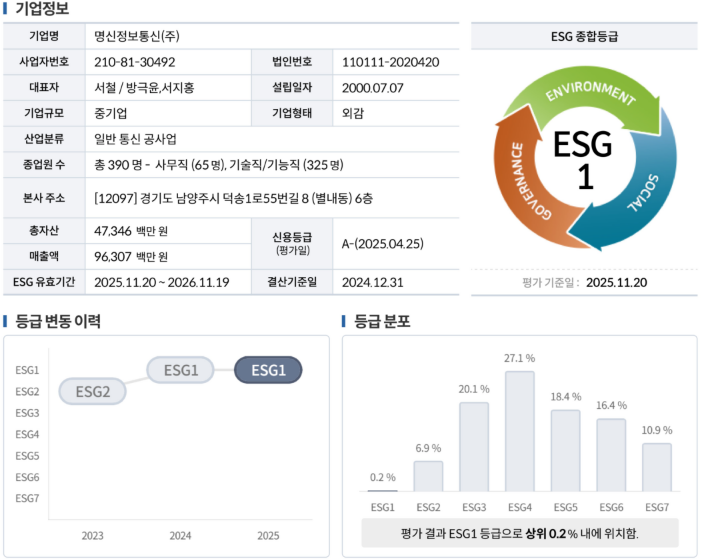 25년 명신정보통신(주) ESG 평가 등급 (ESG 1등급) 페이지 정보 작성자 관리자 작성일25-11-24 14:28 관련링크 이전글 다음글 목록 본문 ESG 평가 등급: ESG 1등급 ESG 유효기간: 2025년 11월 20일 ~ 2026년 11월 19일 이전글 다음글 목록